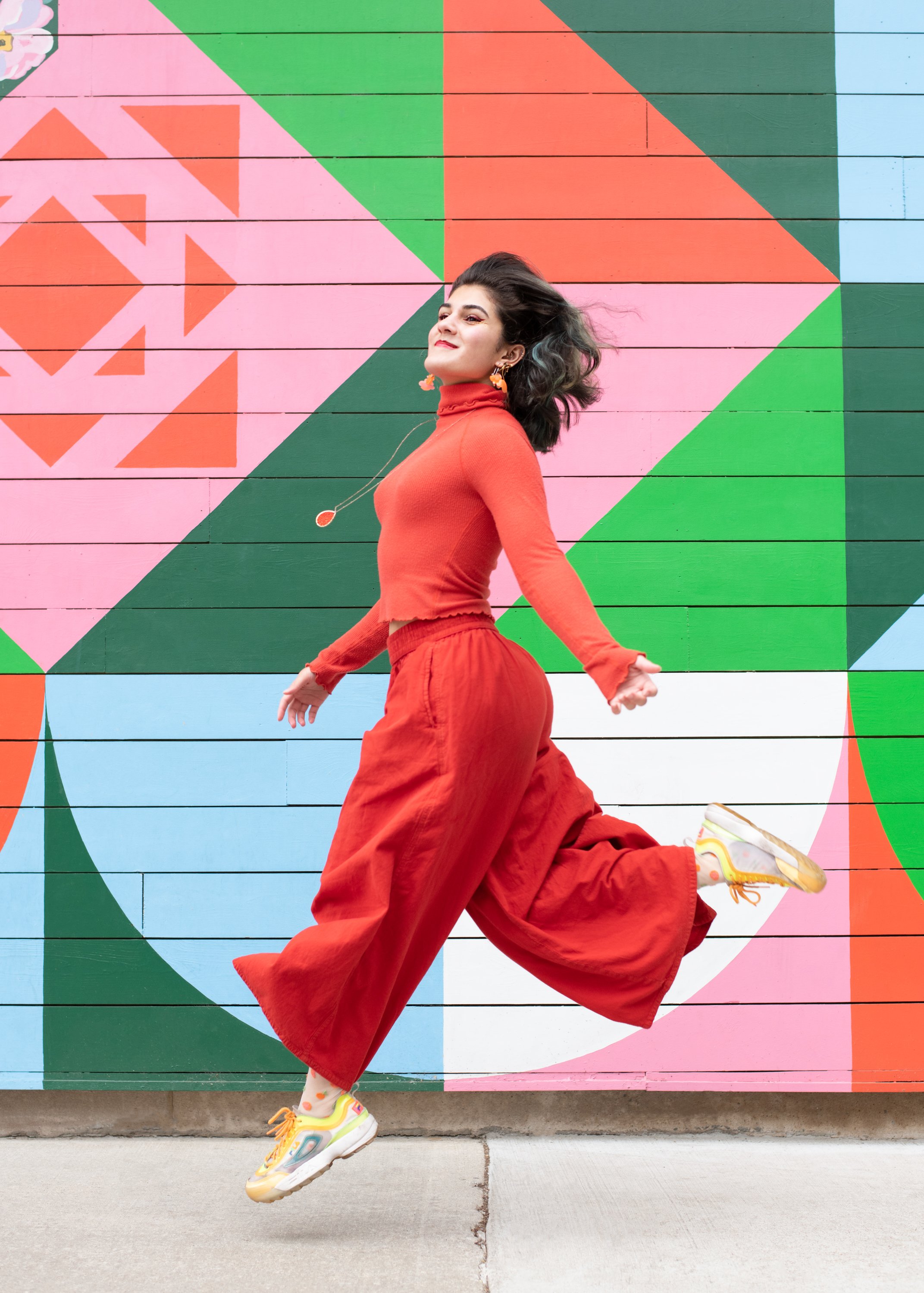 Veronica Gibson, a young woman wearing all orange jumps in front of bright color mural in Chicgao, IL. Professional photos by Mary Rafferty a chicago commercial, editorial, and portrait photographer.