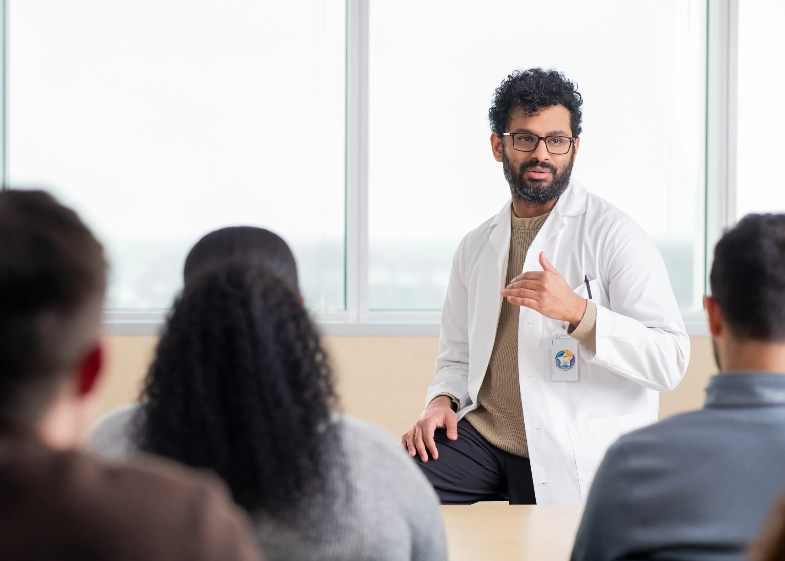 A doctor sits on the table and talks at people in front of him in spacious windowed room in Chicago, IL. Professional photos by Mary Rafferty a chicago commercial, editorial, and portrait photographer.