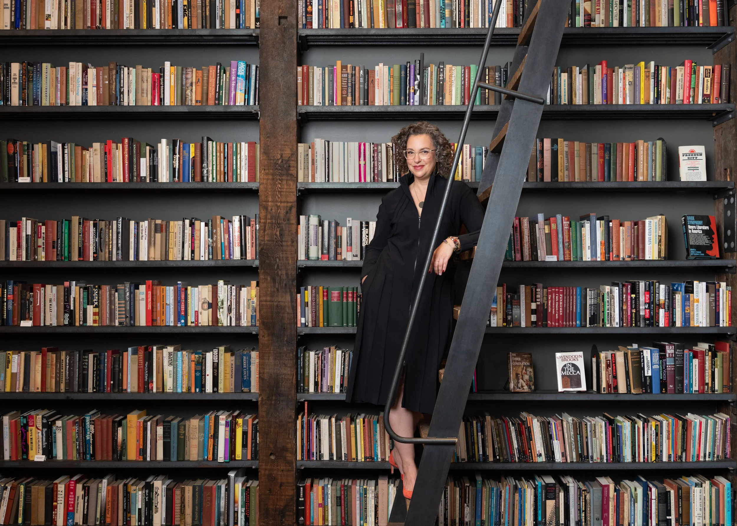 Woman is standing on ladder inside giant library of books at south shore community art center in Chicago, IL. Professional photos by Mary Rafferty a chicago commercial, editorial, and portrait photographer.